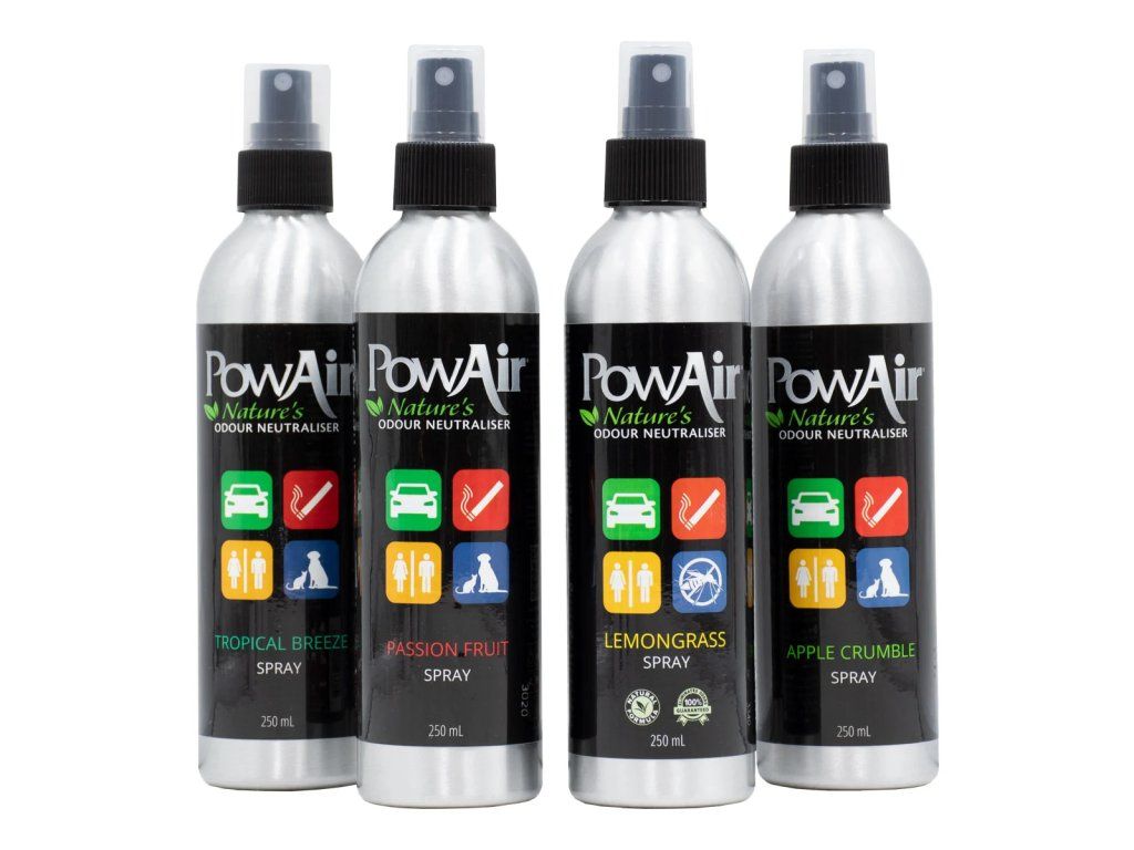 PowAir Spray sa dá použiť v akomkoľvek prostredí na rýchlu a účinnú neutralizáciu nežiaducich pachov. Vďaka novej ponuke vôní tento rýchly neutralizátor zanecháva v miestnosti príjemnú a dlhotrvajúcu vôňu tým, že napáda molekuly pachu priamo pri ich zdroji. Poskytuje rýchle a účinné riešenie na neutralizáciu pachov pred príchodom hostí do vášho domu, kancelárie alebo pasažierov do auta.